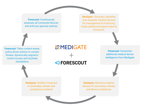 Решението позволява откриване и класификация на IT устройства, OT, IoT и IoMT (Internet of Medical Things) - инструменти и софтуер, които се използват за лечение и спасяване на животи. Решението опростява управлението, подобрява ефективността на използването, открива уязвимости и рискове на ниво мрежа и крайно устройството. Благодарение на разработените усъвършенствани методи за пасивен мониторинг и задълбочен анализ на трафика (DPI), платформата постига висока ефективност в събирането на контекстуални данни без риск от смущения в работата на медицинските устройства и комуникационната инфраструктура. Информацията събрана от Medigate, подобрява видимостта върху свързаните медицински устройства и инфраструктура, благодарение на което Forescout eyeSigth може да реагира адекватно в различни ситуации.