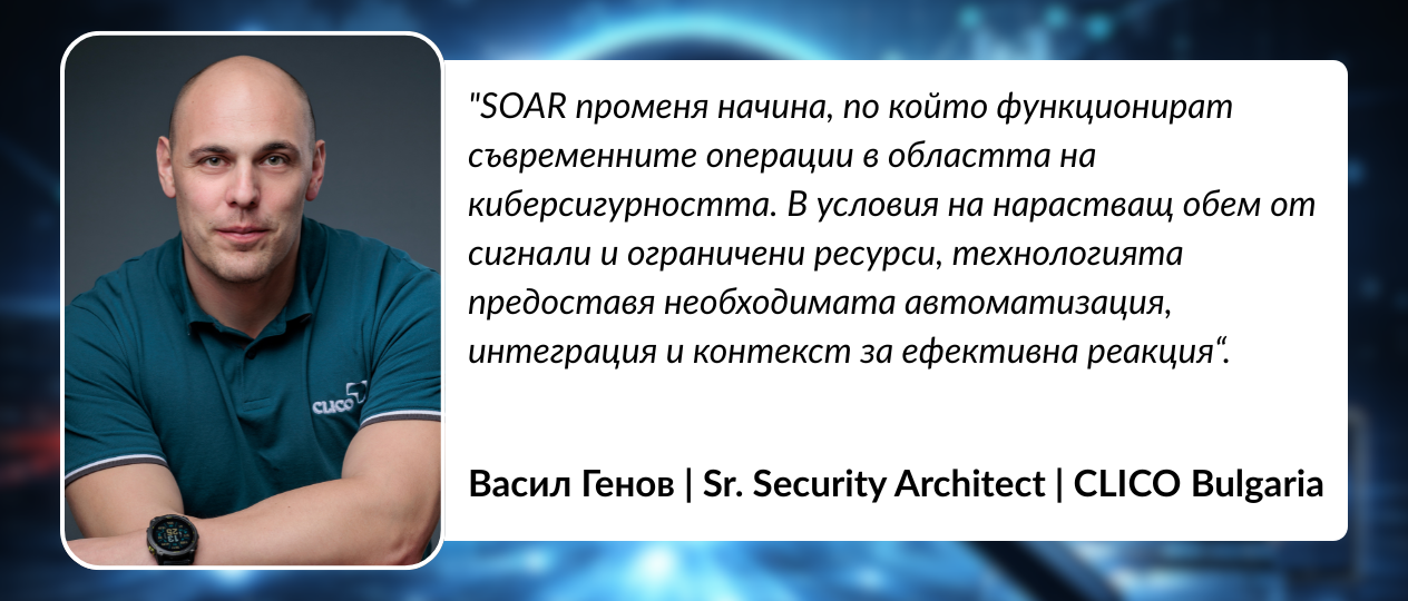 „Често срещана грешка при внедряване на SOAR е опитът за автоматизиране на всичко още в началото“, коментира Васил Генов, старши архитект "Сигурност" в CLICO България. „По-ефективният подход е да се започне с процеси с голям обем и ниска сложност – например обработка на фишинг атаки, разширяване на базата от сигнали или първоначален анализ. Това позволява бързо постигане на резултати и изграждане на доверие в автоматизацията. С времето организациите могат да разширяват обхвата на автоматизацията и да изграждат по-сложни сценарии."